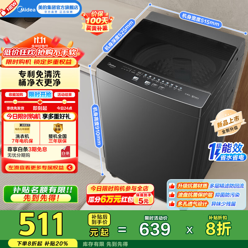 包邮 美的(Midea)全自动波轮洗衣机 8kg公斤家用电器品质电机智能预约立方内桶水电双宽一级能效 MB80V37T
