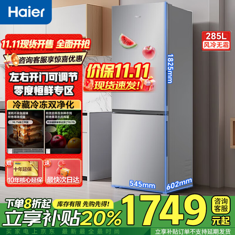 包邮 海尔冰箱285升283升两门三门双开门风冷无霜一级能效家用电器以旧换新电冰箱零度恒鲜左右换开门 285升双门风冷无霜左右开门